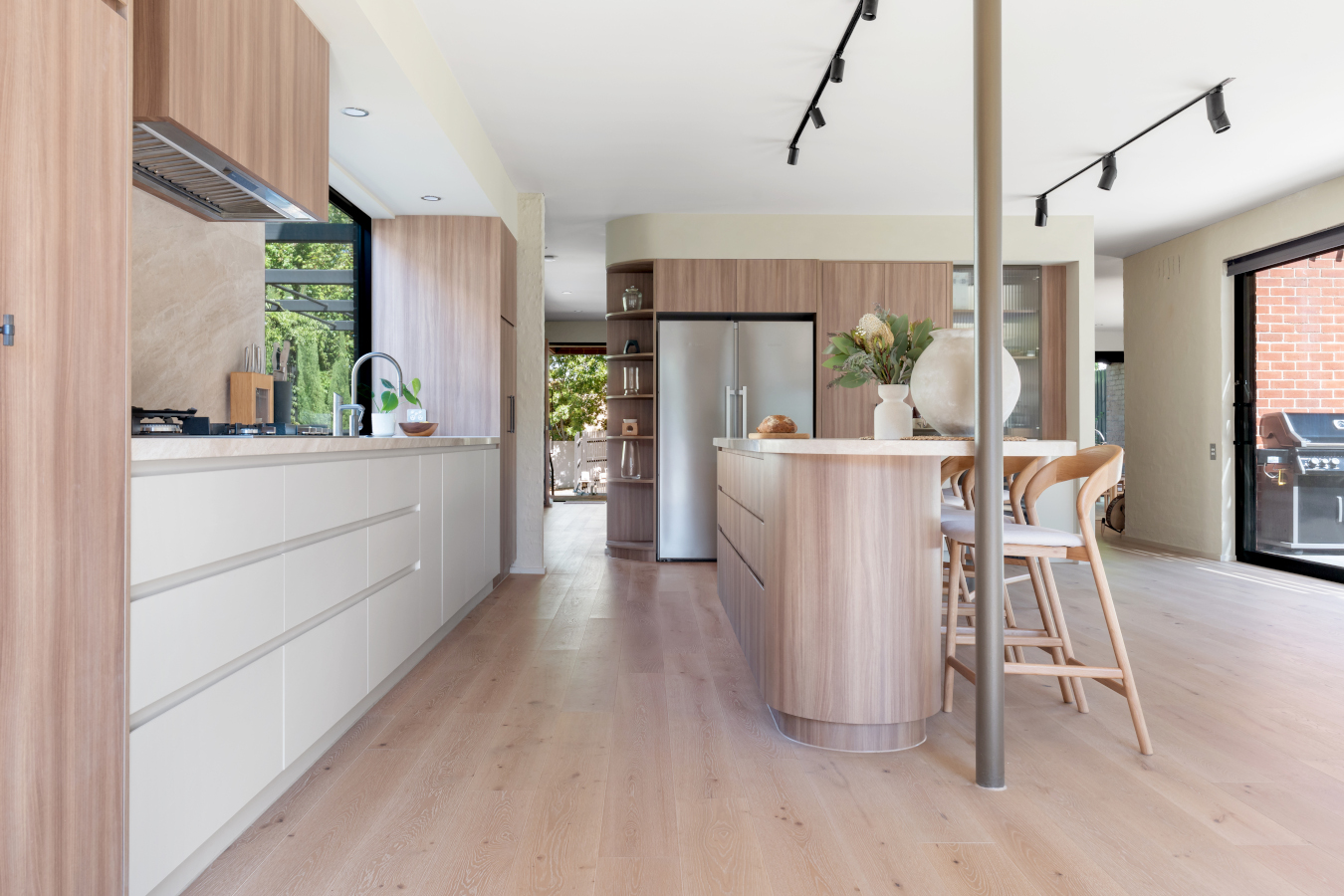 At the heart of the design is the kitchen, a true centrepiece shaped around this family’s love of cooking and sharing food. From the outset, the brief called for a generous bench where everyone could gather, a dynamic hub where cooks and diners can swap places and enjoy the space together. It was envisioned as the setting for long conversations and vibrant family activity.