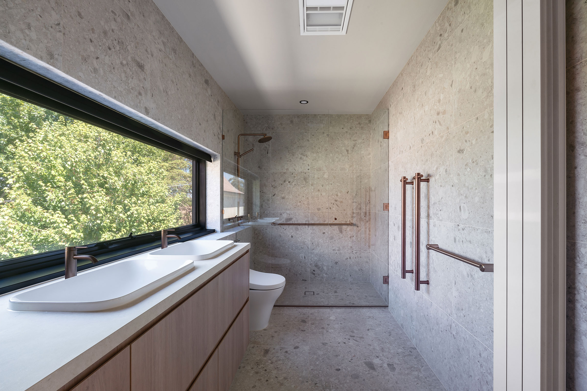 Internal finishes were carefully curated in collaboration with KHID, where neutral tones create a soft, understated backdrop. Bronze tapware, hardware and framing, paired with fluted glass and warm timber furniture, add a refined elegance.